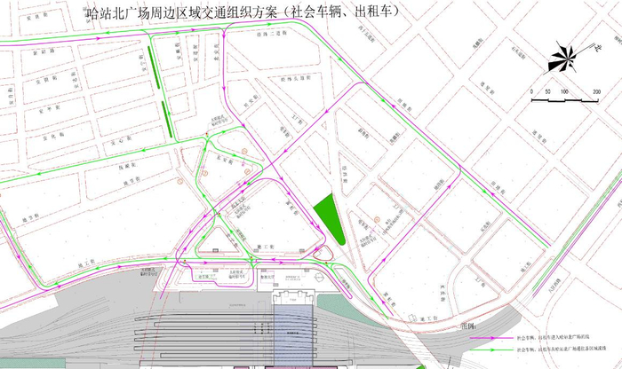 上述车辆沿地工街驶入哈站北广场西侧临时停车场;来自尚志大街车辆,沿海城街辅道左转进入地工街,驶入哈站北广场西侧临时停车场,驶出车辆经新打通的安宁街、地德里街驶出;同时允许出租车沿地工街右转驶入霁虹街。