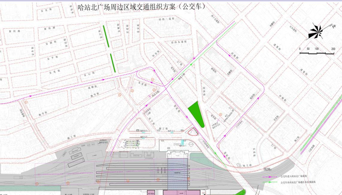 等客车辆由地工街和安宁街交叉口调头,驶入哈站北广场东侧临时停车场,允许出租车由临时停车场右转沿霁虹街驶出或沿地工街左转由安宁街、地德里街驶出;