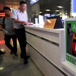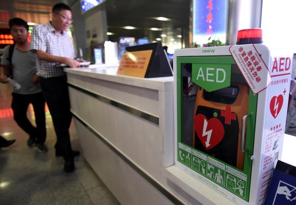 一台设置在杭州火车东站候车厅服务台的AED自动体外心脏除颤器。视觉中国 图