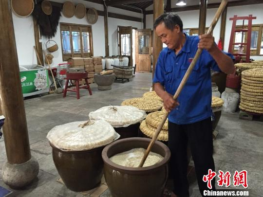 直逼38度的高温里,博物馆内的古法酿酒展示区,资深酿酒师张米良在没有空调的环境里,演示起了“开耙”的工序,“所谓‘开耙’,就是发酵期间的搅拌冷却,这是酿酒中极为重要的一个环节,温度要保持在33-36摄氏度,它保证了黄酒的醇香。”