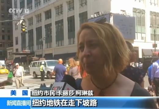 纽约市民 卡丽莎·柯琳兹:纽约地铁在走下坡路,我在纽约已经待了20年,纽约地铁变得更慢更脏了。我不太愿说我感觉更不安全了,但是有时候的确是这样。