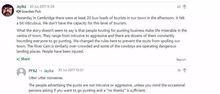 当地居民意见不一。有剑桥居民认为超过20辆的巴士停在市中心,显然已经超过了当地接待能力;一些兜售旅行服务的人变得越来越霸道,必须采取措施加以限制。而有的网友则不同意这种看法,认为情况远没有描述得那么可怕。