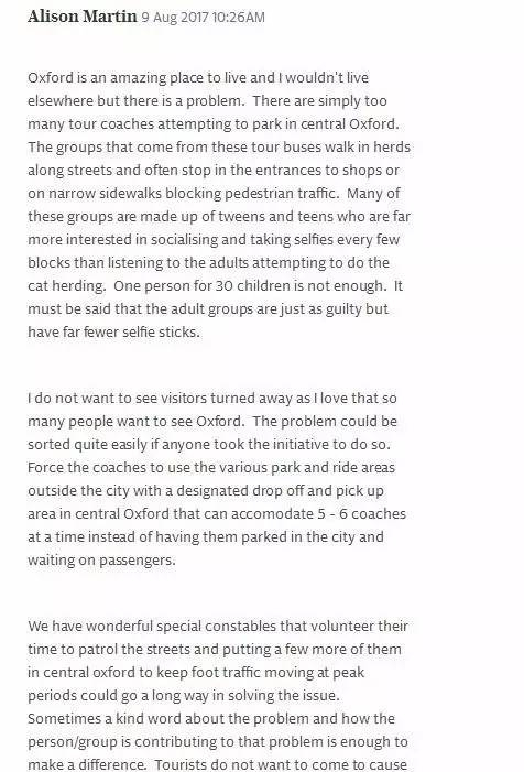 一名牛津居民在脸书上说,她的妈妈需要坐轮椅出行,而挤满游客的大街让这变得困难。另外也有人抱怨,不少旅行大巴停靠在市区,挤占本就狭窄的道路,让骑自行车变得更加危险。