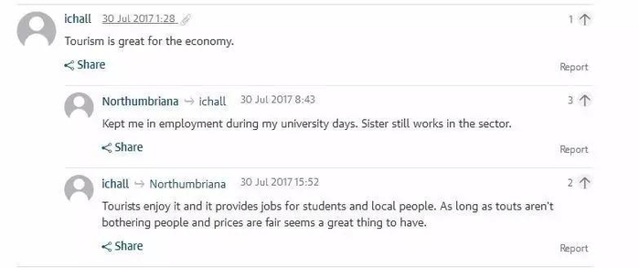但有的网友则认为,旅游业不一定使当地民众受益,受益的只是快餐店、中介公司、留学中介等。过多的游客还可能抬高房价。