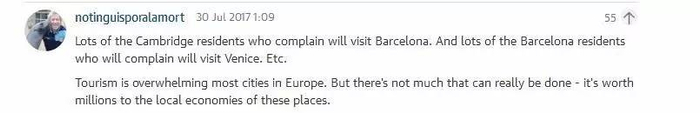 也有民众犀利地指出,抱怨游客过多的剑桥居民也会去巴塞罗那旅游,抱怨游客过多的巴塞罗那民众也会去同样受困扰的威尼斯旅游。旅游业爆棚在欧洲是一种普遍现象,能做的并不多。至少对当地经济意味着数百万英镑。