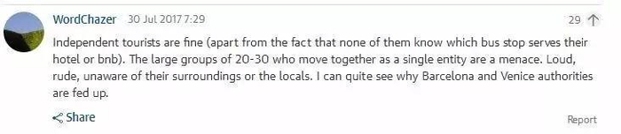 有网友表示,单独的游客还好(除了大多数不认识路外),而20—30人一起行动的旅行团则有些可怕。他们说话大声、粗鲁、随意。终于可以理解巴塞罗那、威尼斯的民众为什么会感到厌倦。