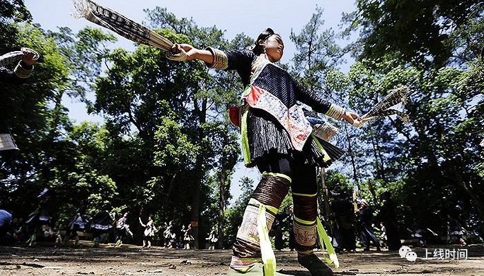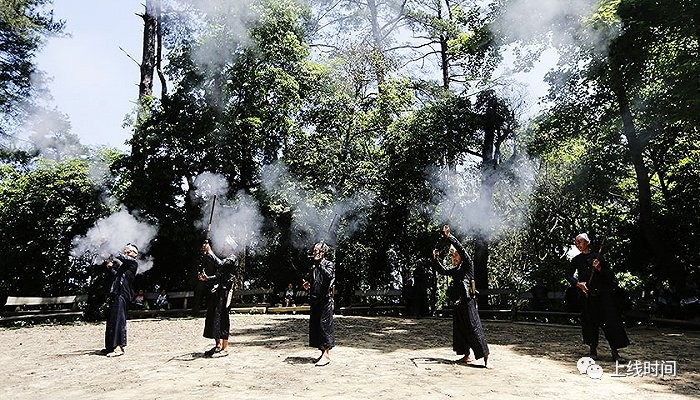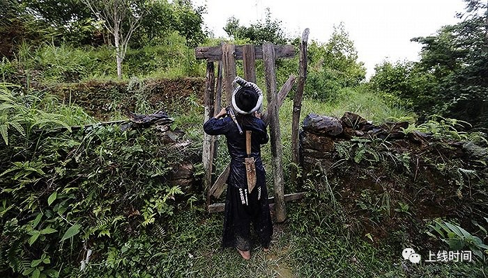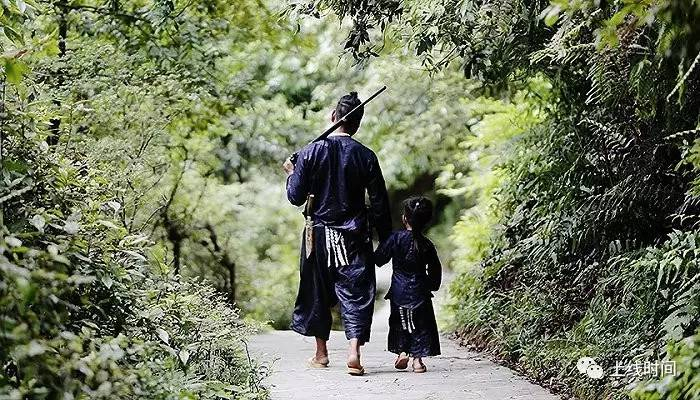 ▲传说苗族的祖先蚩尤有三个儿子,岜沙人就是第三个儿子的后裔。当年蚩尤被黄帝打败,率领部落开始了向西南的千年长征。岜沙苗族的祖先就是大迁徙的先头部队——九黎部落的一支。他们开山劈路、鏖战熊罴,勇武之至。岜沙男人崇尚武力,平时身着自织的无领右开衫铜扣青布衣,直统大筒裤,青布裢,常年身挎腰刀,肩扛火枪,上山打猎,下河打鱼。爬山上树如履平地,极擅长爬山打猎,衣食住行均取之于山林河谷。他们十分重视自己身体的强壮,狩猎与耕作技术高超,还特别强调装束和身体的标志。视觉中国