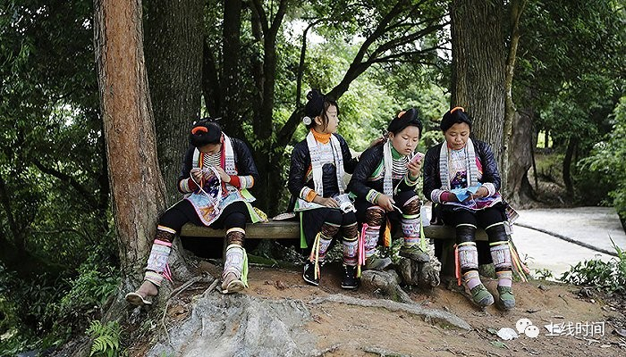 ▲岜沙的女性着装也极为精美,衣裙上古香古色的刺绣图案,配以银项圈、手镯,十分耀人眼目。岜沙人头上的发髻象征着树木,身上的青布衣象征着树皮。岜沙人感恩这片土地、森林的荫庇。视觉中国