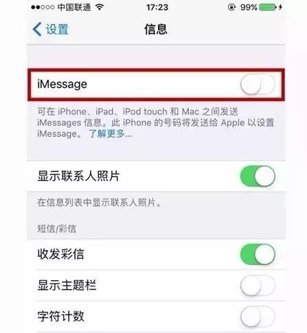 1、关闭iMessage功能,设置方式是依次点击手机的【设置】——【信息】——将第一项【iMessage】关闭,关闭后facetime功能就被禁用了,自然没有骚扰了。