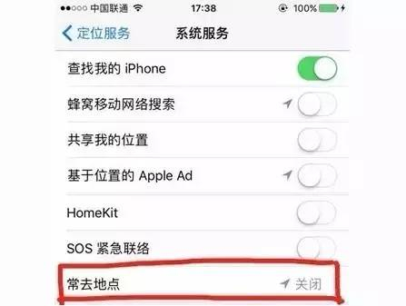 5、关闭“常去地点”功能,苹果公司可以收集我们日常的定位信息,经过大数据分析能得出我们的一些隐私信息,关闭该功能方法:先打开【系统服务】—— 点击【常去地点】并关闭;