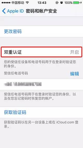 开启双重认证后,即使你有 Apple ID 密码仍需要受信任设备或受信任的电话号码接收的验证码才能登陆。