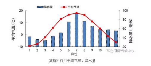 首都莫斯科属温带大陆性湿润气候。冬冷夏热,1月平均气温-9.3℃,7月平均气温18.2℃。气温起伏大,夏季最高气温超过37℃,冬季最低气温低至-43℃。年降水量689毫米,年积雪期长达146天(11月初至次年4月中)。