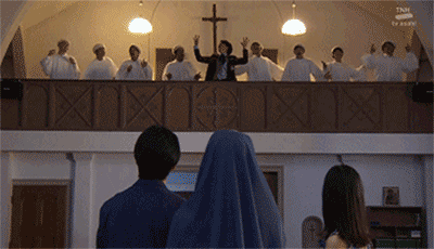 有情人终成眷属的关键时刻,没有漫天焰火、没有喷泉玫瑰、没有拥抱亲吻,背景朴素到家徒四壁立、朴素到苍天为庐地为席,只有山崎育三郎的角色上蹿下跳地在一对异性恋情侣中间穿梭、在周围徘徊,一面恭喜新人,一面歌颂爱情。