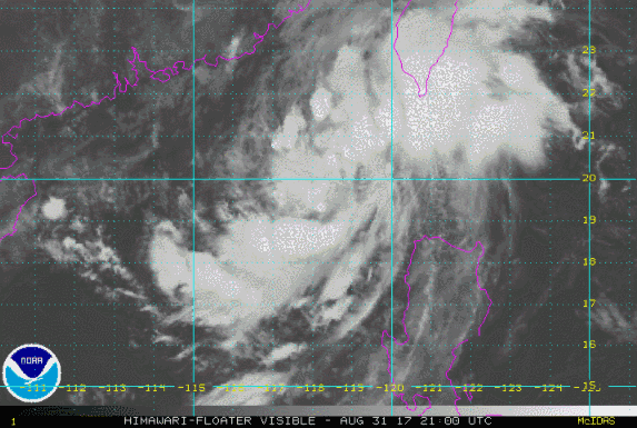 ↑今年第16号台风“玛娃”生成前后云图动画(时间:8月31日22时00分至9月1日05时00分) 玛娃昨夜诞生,本周日即登陆
