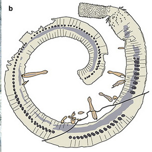 此次,丛培允研究员(第一作者)、马晓娅研究员(通讯作者)、翟大有副研究员以及侯先光教授等人发现了一种附着在其他蠕形动物身体上的疑难化石,命名为吸盘古宿虫(Inquicus fellatus)(图-1,2)。古宿虫身体也呈蠕虫形状,大小只有3mm左右,身体结构简单,最显著的特征是保龄球瓶状的身体、尾部的吸盘和贯穿身体前后的肠道。古宿虫最令人惊奇的地方在于其以群体形式吸附在晋宁环饰蠕虫(Cricocosmia jinningensis)和中华马房古蠕虫(Mafangscolex sinensis)身体上。后两种蠕虫动物是澄江生物化石群中比较常见的化石种类,但到目前为止,也仅发现了7块吸附有古宿虫的标本。研究人员通过进一步检查澄江生物化石群十多种蠕形动物的几千块标本,确认了仅有晋宁环饰蠕虫和中华马房古蠕虫被古宿虫吸附(或者有它们附着的痕迹),表明古宿虫具有一定的宿主特异性(即感染特定的宿主)。晋宁环饰蠕虫和中华马房古蠕虫亲缘关系比较近,且具有相似的形态特征和生态位,从而使得古宿虫得以在这两个不同的宿主之间进行转移。