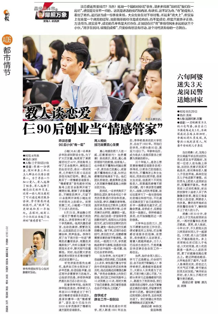 别看李伟年轻,他和同样年轻的吴剑、李梓奇三人早在2013年就成立了专门进行情感咨询服务的团队,是深圳最早一批“情感管家”,团队至今已经为约5000名学员提供了情感沟通方面的咨询服务。