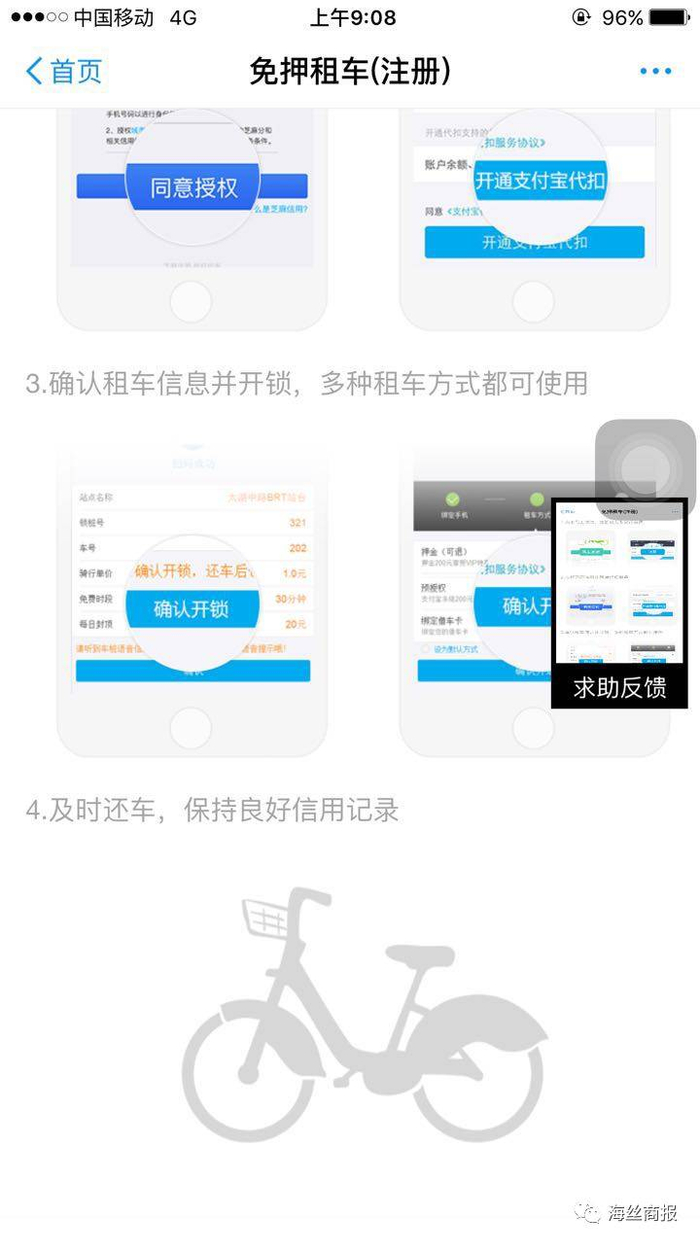 记者选择扫码租车,接着按照步骤,选择了租车模式,支付了200元的押金,显示“扫码成功”。同时,页面也显示出了“站点名称、锁桩号、车号、骑行单价、免费时段、每日封顶”等使用信息。点击“确认开锁”。记者成功租借到自行车。