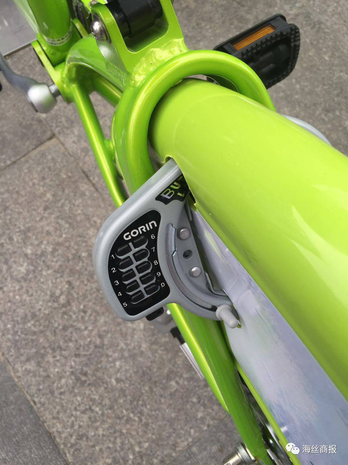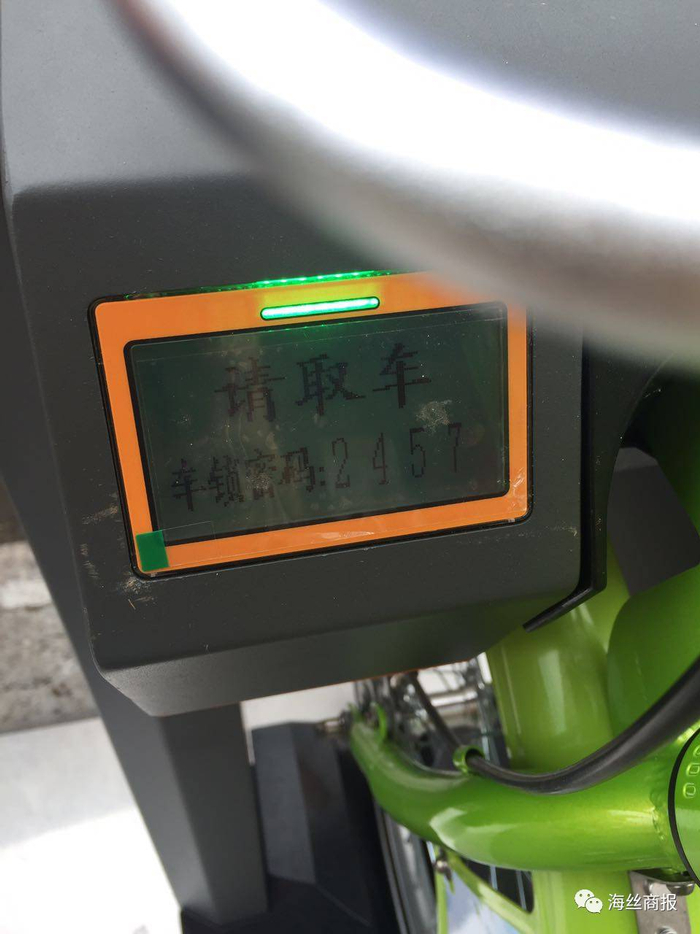 这时,桩机右侧的页面,显示“请取车,车锁密码2457”,并有女声连续提醒。这是什么呢?原来是,要在后轮的车锁上按密码,相应输入密码后,按下密码锁下面的按钮。“哐当一声”,解锁成功。租车成功啦!