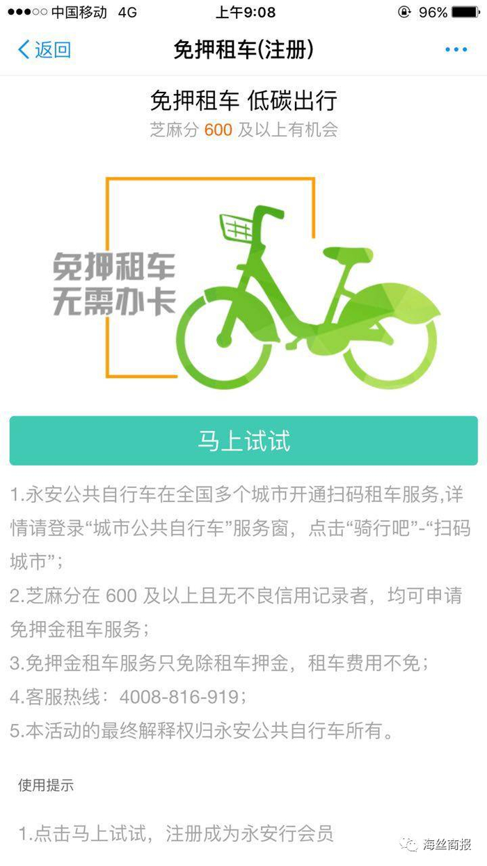 回想之前公布的收费标准,使用支付宝和永安行APP的,只要芝麻信用分达到600分以上的,将可以免押金借车,直接把信用当钱用。