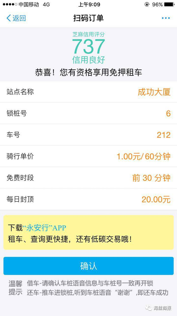 记者的芝麻信用评分有737分,属于信用良好的用户。窗口下面一行显示——“恭喜!你有资格享用免押租车”!页面同时也显示出了“站点名称、锁桩号、车号、骑行单价、免费时段、每日封顶”等使用信息,记者浏览了一遍,确定无误后,点击了确认。