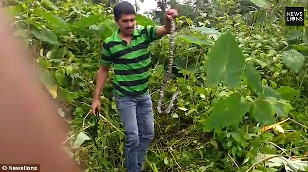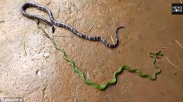 志愿者说,金环蛇是印度毒性最强的蛇之一,生活在丛林里。而被它吞下去的那条绿蛇,学名叫藤蛇,微毒,食物主要以青蛙和蜥蜴为主。志愿者最后将这条一身轻松的金环蛇放回野外。