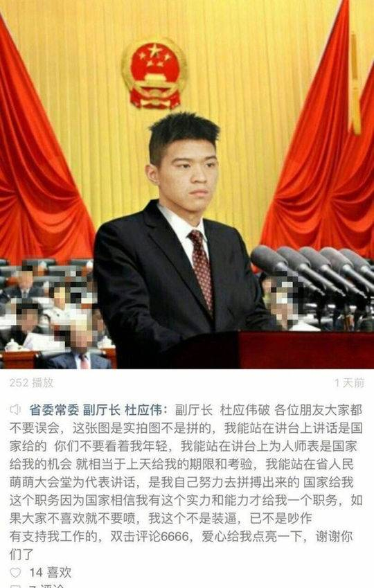 此外,该男子在8月24日发布的一段文字截图显示,“云南省公安厅副厅长杜应伟在九寨沟地震前前往灾区看望人民,并且向九寨沟捐款26万元”,文字内容下配发了一张疑似他在会堂开会作报告的照片,他辩解称,“这张图是实拍不是拼的,我能站在讲台上讲话是国家给的,你们不要看着轻我年轻,我能站在讲台上为人师表是国家给我的机会……我这个不是炒作,有支持我工作的,双击评论6666”。