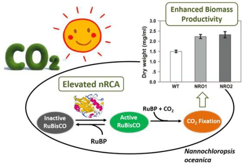 工业产油微藻能通过光合作用将二氧化碳与光能大规模地转化为油脂,因此作为一种清洁能源生产和二氧化碳高值化的潜在方案,在国内外受到了广泛关注。针对如何提升工业产油微藻的固碳能力这一关键问题,中国科学院青岛生物能源与过程研究所示范了一种通过调控RuBisCO(核酮糖-1,5-二磷酸羧化酶/加氧酶)的激活酶来增强细胞固碳活性,从而大幅度提高微藻生物质与油脂产率的策略。该工作在线发表在Algal Research上。