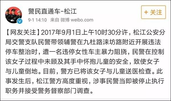 从这段视频中可以清晰看到,一辆编号P8440制式警车停靠在路边。车牌号为沪A开头。据网友提供线索,这辆警车应隶属上海市公安局松江分局。松江分局宣传科袁警官对此向封面新闻证实,视频发生事件发生在9月1日上午10点,事发地点位于上海松江九亭。被摔孩子没有什么大碍。