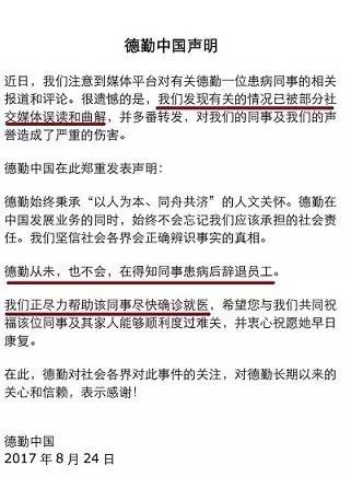 公司发声明否认辞退患病员工,