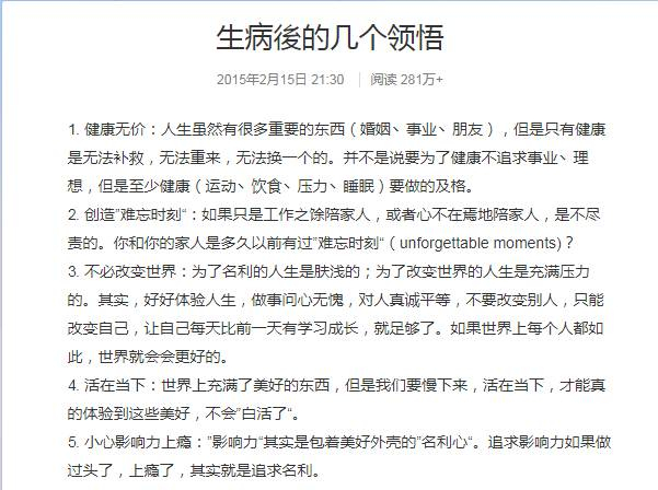 他对健康的感悟想必更能引起人们的共鸣……
