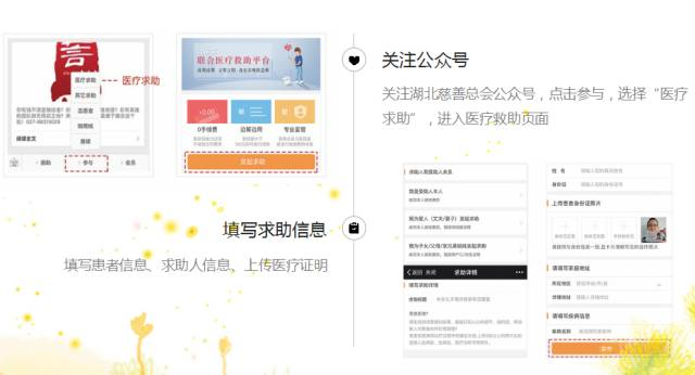 患者可登陆“湖北省慈善总会”微信公众号进入该平台进行资金募集,在注册成功后,即可参与“医疗救助”,同时也可分享筹款。