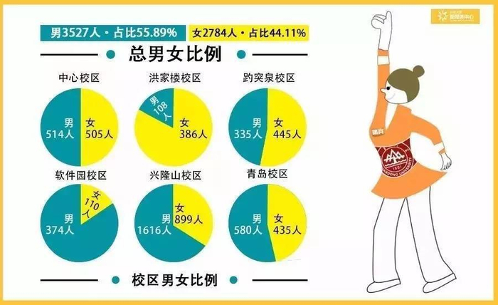 虽然山大全校新生的男女比较为均衡,但在男生占比较多的软件园校区,平均每10个人里就有7.7个男生;而在洪家楼校区,平均每10个人里就有7.8个女生。建议软件园的鲜肉们多坐校车去洪家楼转转……