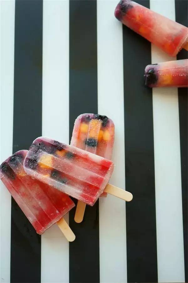 3. 舀一勺蓝莓酱到雪糕模子里,放入芒果块及新鲜蓝莓,倒入西瓜汁,至八分满;