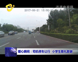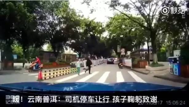 8月17日15时06分,云南普洱的司机斑马线前停车让行,孩子鞠躬致谢。