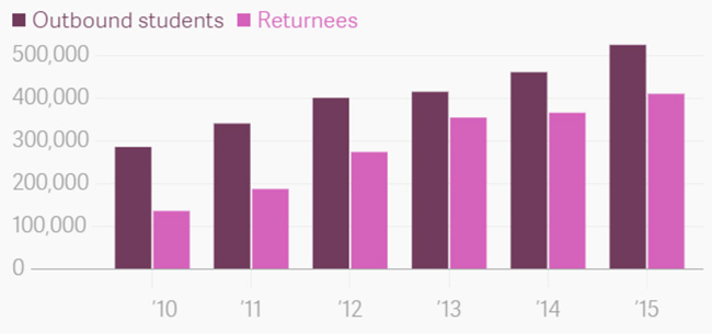 根据中国教育部的数据,523700名中国学生在2015年赴美留学,较前一年增长13.9%。过去几年,赴美中国留学生数量增长都在10%以上。