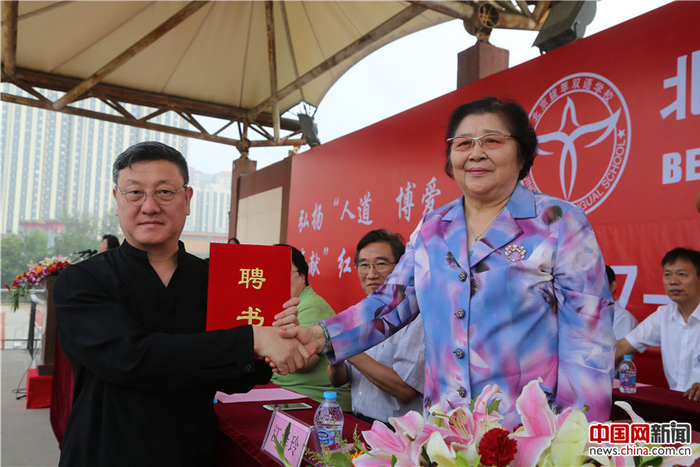 北京拔萃双语学校名誉校长江泽玲向学校艺术教育特聘校长韩磊颁发聘书。