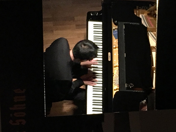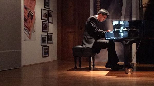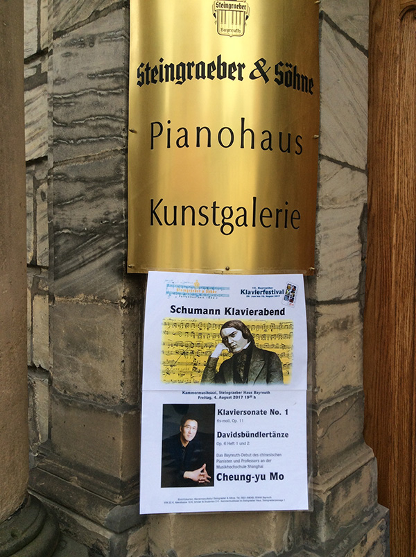 史坦格列伯的室内乐厅位于佛烈德里希大街原名列布哈特宫(Liebhardt Palace)的宅邸,这是幢洛可可时期的建筑,1871年为史坦格列伯家族购入。瓦格纳和李斯特都是列布哈特宫的常客,1882年《帕西法尔》(Parsifal)在拜洛依特首演时,代替教堂钟声的钟琴(Parsifal Bell)便由史坦格列伯公司设计。史坦格列伯厅固定举办的音乐会和讲座培养了一批固定听众,八月四日的独奏会于晚间七点半开场,七点一刻不到,室内乐厅几乎就满座了。稍事调整后,毛翔宇像用中锋写毛笔字般弹出奏鸣曲第一乐章深沉的和弦,右手再接着吟唱出悲歌一般的旋律。第一号钢琴奏鸣曲写作时正值舒曼与埃涅斯婷·冯·弗莉肯(Ernestine von Fricken)解除婚约,陷入对克拉拉的恋情狂喜与痛苦的两极情感,第二乐章的浪漫曲如同尚·保罗“没有爱情的生活就像一个月蚀的夜晚”的名言,像静夜之中的冥想。毛翔宇的肢体动作虽然相当丰富,但没有任何表演的成分,用身体不同的部位来加强(或抑制)音乐的张力与幅度。最让人惊讶的,是他对色彩和声部的经营,在《戴维同盟之舞》中,尤其丰富。