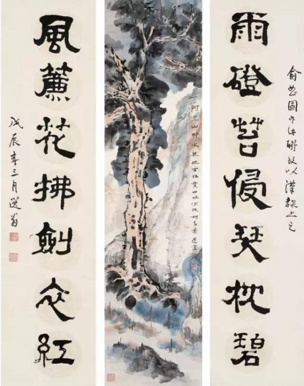 绘画方面,擅山水画,写生及于域外山川,不拘一法,而有自己面目。人物画取法白画之白描画法,影响颇大。书法方面,植根于文字,而行草书则融入明末诸家豪纵韵趣,篆书兼采谷口、汀洲、冬心、完白之长。从大幅中堂、屏条、对联到方寸空间小品,风格多样,而沁人心扉的书卷洋溢于每件作品之中,允称文人书画。 山水对幅,1960年代