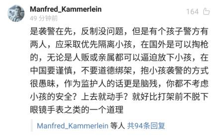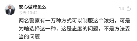 网友@沈诚律师 表示两名警察的行为有损人民警察的形象,推搡警察是违法行为,确实可以采取必要措施,但抱摔女子时不顾孩子实不应当,应该把孩子的安危放在第一位。