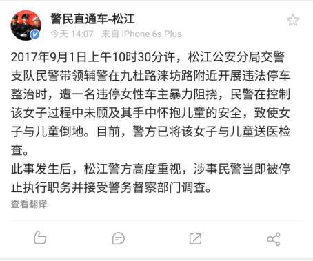 此后松江公安局通过官方微博证实,事发时间为9 月 1 日上午 10 点半左右,松江公安分局交警支队民警正带领辅警在九杜路涞坊路附近整治违法停车,遭到这名女性车主的阻挠。事后警方将该女子和小女孩送到医院检查,而两位涉事民警也当即被停止执行职务并接受警务督察部门调查。