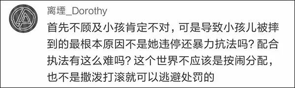 视频中最令人揪心的一段,是一位身着交警制式警服的警察,对一位怀抱娃娃女士执法时,采取“绊摔”方式对女士进行控制,期间因女士当时左手正抱着孩子,娃娃也随着女士倒地。孩子着地后,哭喊声较之前更大了一些。