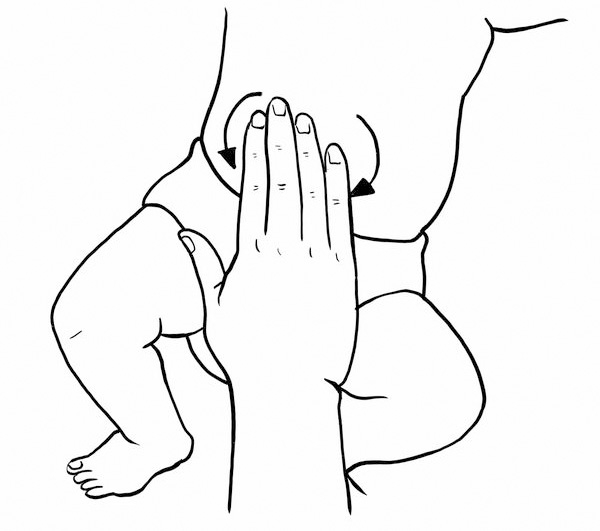 摩腹:以手掌掌面或食、中、无名指指腹着力于腹部,以腕关节连同前臂有节律地做环形摩擦,摩腹需用力轻柔缓和,速度均匀协调,压力大小适当,操作3-5分钟。顺时针摩腹具有消食、和胃、通便之效,逆时针摩腹则具有健脾、止泻的作用。