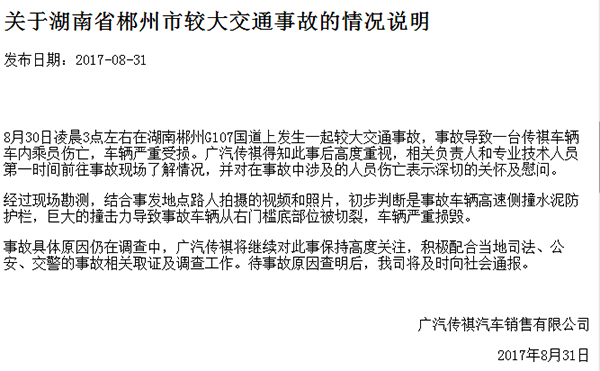 事故发生后一天,广汽传祺立即做出了回应,称将积极配合调查事故原因,并结合事发地点路人拍摄的视频和照片给出了初步判断,“事故车辆高速侧撞水泥防护栏,巨大的撞击力导致事故车辆从右门槛底部位被切裂,车辆严重损毁。”