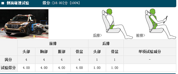 事实上,广汽传祺GS4 200T 手自一体豪华版曾参与中国新车评价规程(C-NCAP)的碰撞测试。从碰撞结果来看,虽然在碰撞试验结束后三分钟内,发动机舱出现明火,按照2015版C-NCAP的规则,这款车最终只得到了4星的综合评价等级,但仅仅就侧面碰撞单项成绩来看,广汽传祺GS4却得到了18分的满分成绩(C-NCAP侧面碰撞测试是通过移动壁障以50公里/小时速度撞击车身侧面)。