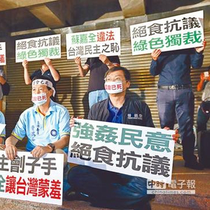 因不满“立法院长”苏嘉全只处理民进党团所提的“前瞻预算删减案”,无视国民党上万提案,国民党“立委”曾铭宗、赖士葆、费鸿泰自29日晚间7时起,在“立法院”门口绝食抗议,禁食40小时。意料之中,“蓝委”们的绝食行动并没有让蛮横的民进党有所动摇。
