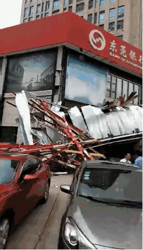 8月31日下午三点半左右,东莞市东城区东莞大道汇业大厦停车场里一个二三十米高的巨型广告牌突然倒塌,八汽车被砸毁,暂无人员伤亡。