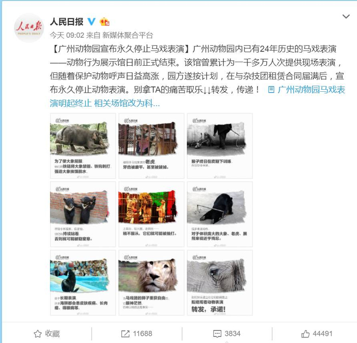 每经小编(微信号:nbdnews)注意到,@人民日报 微博也在今天(2日)上午发出了拒绝观看动物表演的倡议。