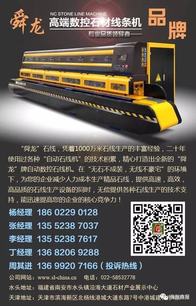 据了解,8月份刚刚推出的舜龙高端数控磨边机是历经2年不断改进的产物,操作简单,易懂,易学对轮换轮方便快捷,装卸磨头空间超大,半个人身子都能在里面来去自如,方便调节轮子和石材之间的精准吻合。预计于11月份实现批量生产。