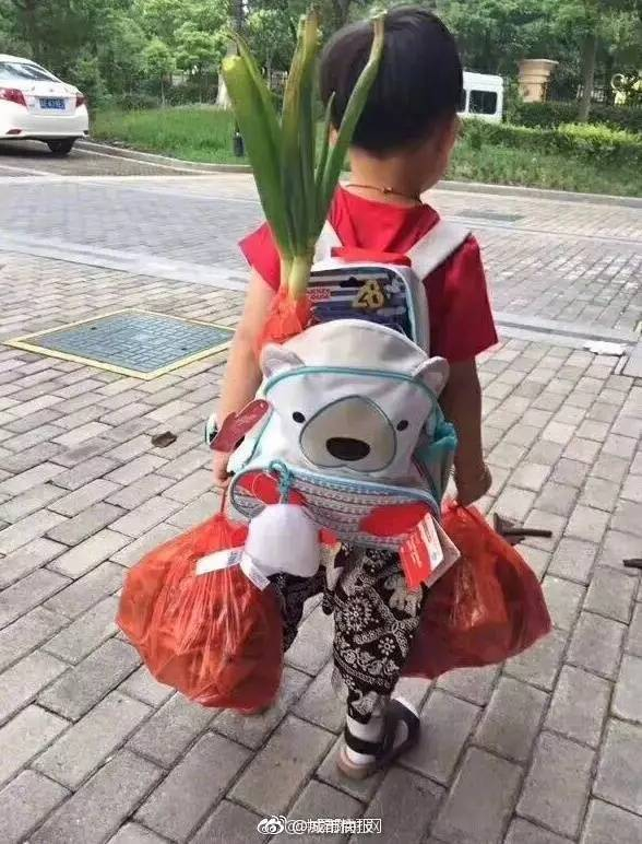 9月1日,江苏常熟市梅李镇的曹女士在朋友圈发了一组儿子的照片,孩子身穿红色T恤,背上背了一个新书包,包里插着两棵大葱非常抢眼,两只手里还各提了一个红色塑料袋。