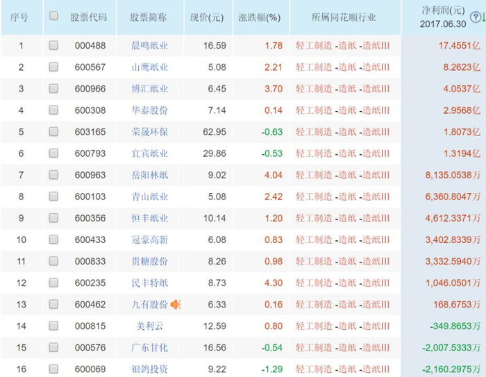 废纸价格上涨,还影响到了部分上市公司的业绩。每经小编(微信号:nbdnews)注意到,据同花顺,截至9月2日,在主板上市的16家造纸企业披露的2017年半年报显示,仅广东甘化、银鸽投资、宜宾纸业三家仍处亏损状态,仅冠豪高新的净利润没有实现同比增长。